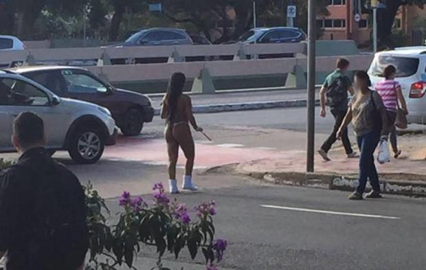 Uma mulher vestindo só uma calcinha fio-dental circulou pela Avenida Ipiranga, na esquina com a Avenida Erico Verissimo, no fim da tarde desta terça-feira. O fato, claro, chamou a atenção de quem circulava pela via, uma das mais movimentadas de Porto Alegre.